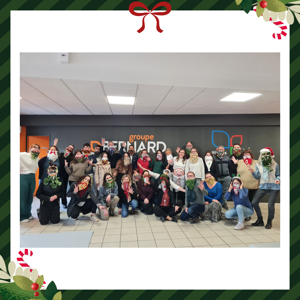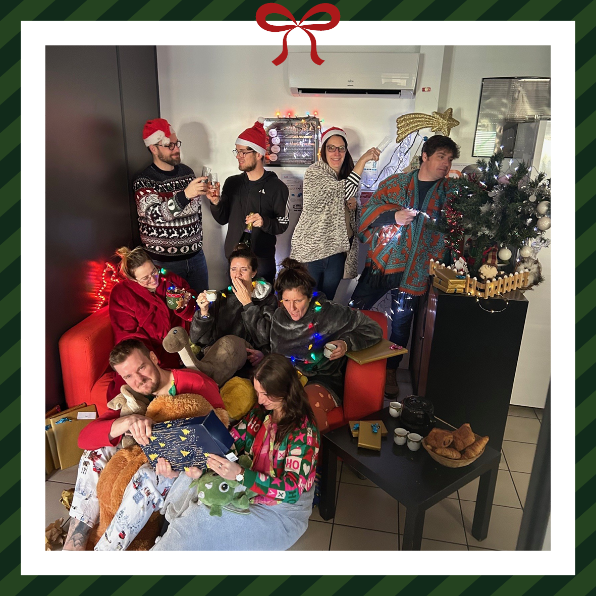 Défi à relever : Organiser une photo de groupe dans le style d'une photo de famille traditionnelle de Noël. Les membres de l'équipe doivent poser de manière humoristique ou élégante en utilisant des accessoires de Noël. Capturer un instant chaleureux et sincères en jouant sur les expressions des visages, les gestes et la disposition des membres.